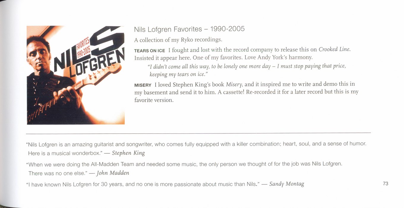 Un folleto de 136 páginas detallado y profusamente ilustrado, con una introducción del destacado periodista de rock Dave Marsh, contiene los comentarios pista por pista de Lofgren y reflexiones personales sobre su trabajo, así como sus turnos de servicio como acompañante con luminarias como Neil Young, Bruce Springsteen y Ringo Starr. El set también contiene homenajes a Lofgren por parte de colegas como Bonnie Raitt, Joe Walsh, Sting, Bono y Paul Rodgers.